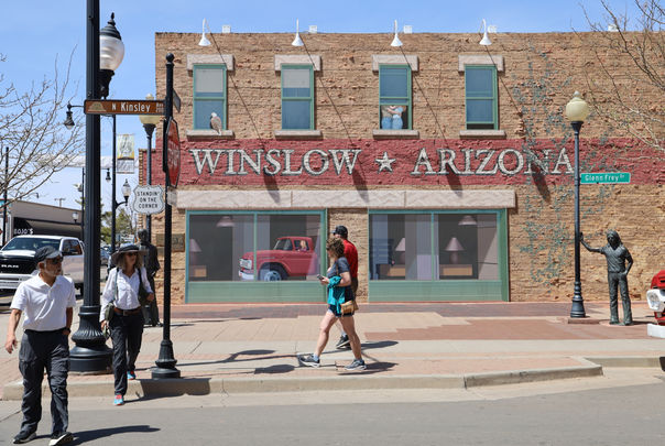 Winslow, Arizona, is a small town along the historic Route 66, famously mentioned in the Eagles’ song "Take It Easy". This shout-out draws visitors to the “Standin’ on the Corner” park in an almost constant flow. Once a bustling railroad town, Winslow is now a quiet destination with scenic views and nearby natural attractions like the Meteor Crater.